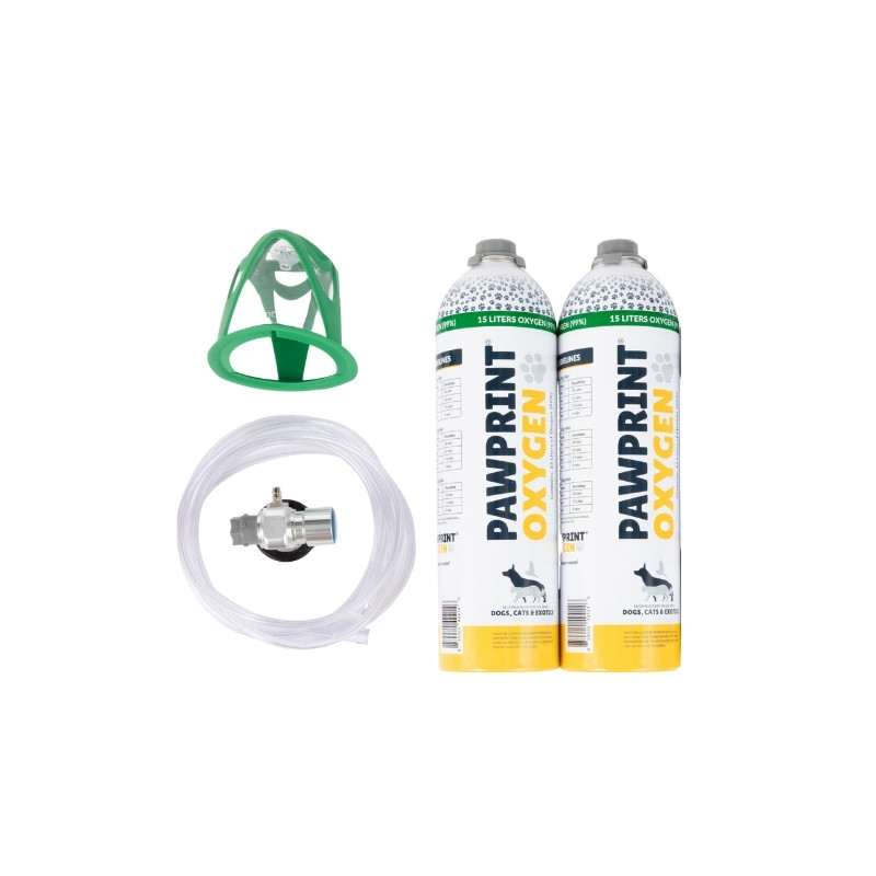 Incluye 2 botellas monouso, una Mascara veterinaria talla M y un tubo, para proporcionar hasta 30 minutos de oxígeno puro al 99% con un flujo de 1,0 LPM. Cada botella dura 15 minutos.