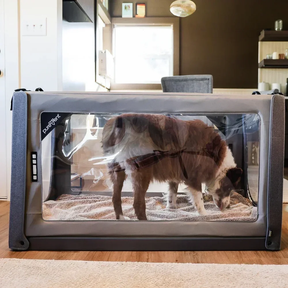 Cuando tu perro o gato con un peso aproximado entre 14 y 30 kg necesita oxígeno de forma continuada, el kit combinado PureVent talla L + concentrador Compact 1025 DeVilbiss es la solución adecuada: completa, segura y profesional.